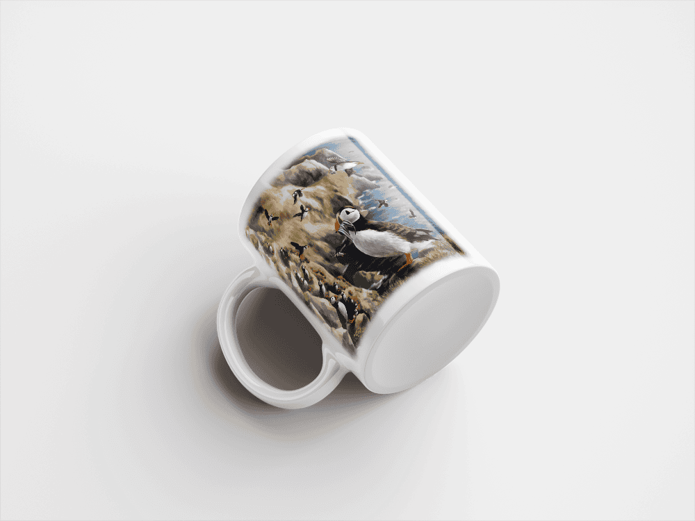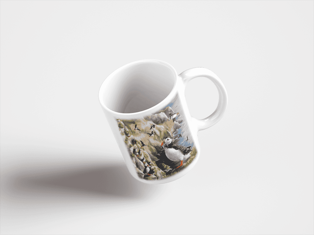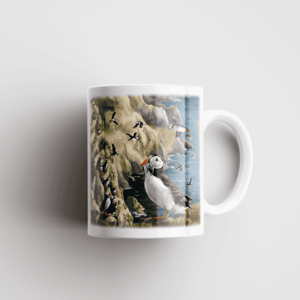 These premium 10oz ceramic mugs feature a delightful puffin design, hand-drawn by one of our talented local artists. This exclusive artwork brings a charming Scottish Highland touch to your mug collection.
