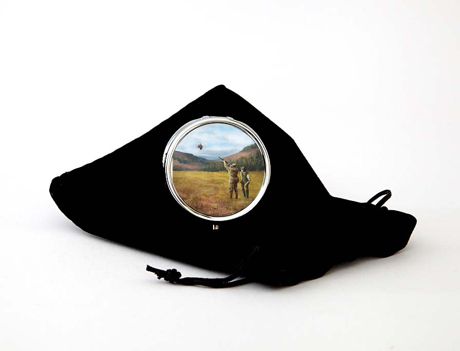 This distinctive round pill box with a clay shooting design features original artwork painted by a local artist.