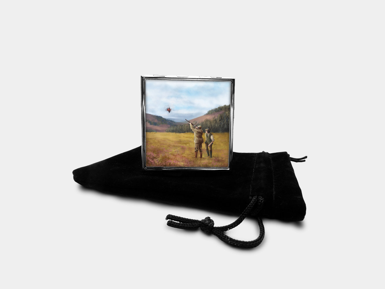 This distinctive square pill box with a clay shooting design features original artwork painted by a local artist.