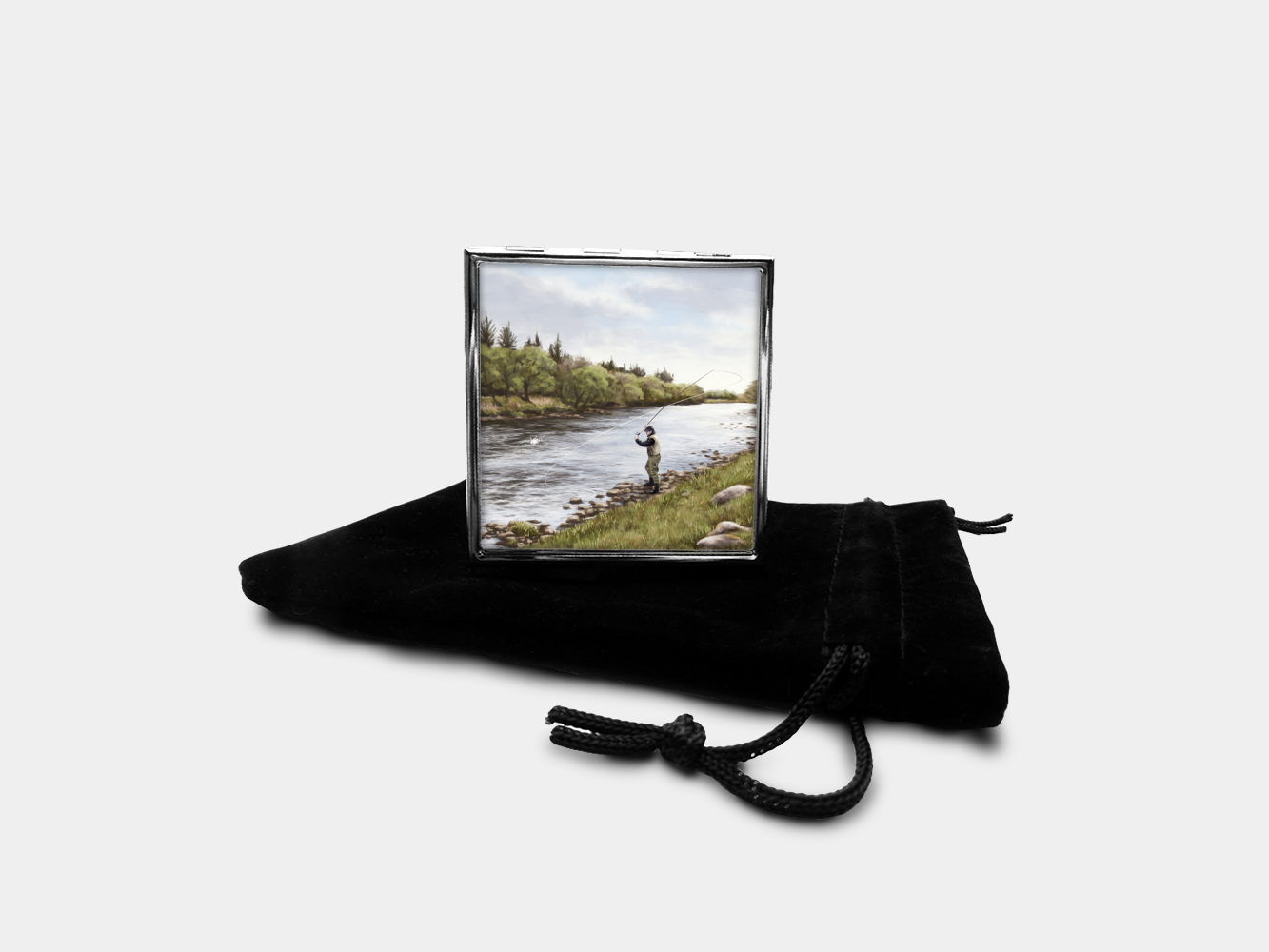 This charming square pill box with a fly fishing design features unique artwork from our Highland Collection, painted by a skilled local artist.