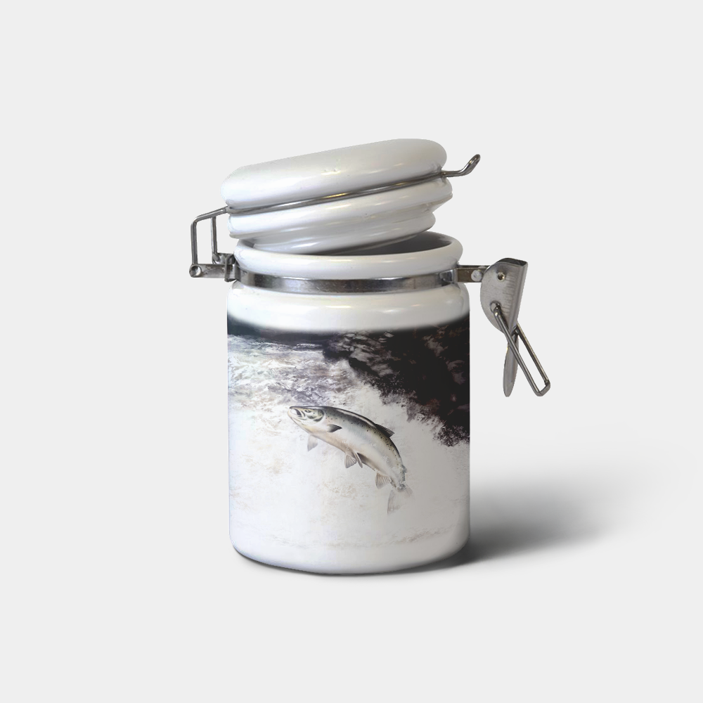 These gloss-finished, ceramic storage jars feature a dynamic Leaping Salmon design, created by one of our talented local artists.