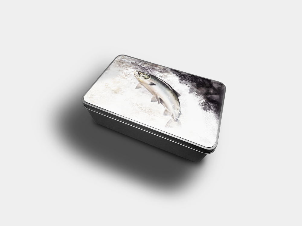 These rectangular, metal tins feature a dynamic Leaping Salmon design, created by one of our talented local artists.