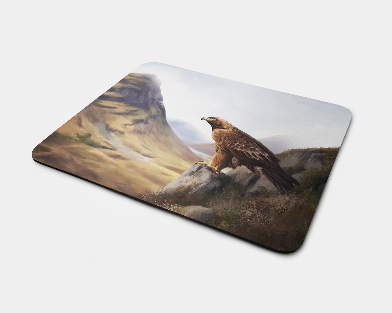 These premium fabric-topped, rubber-based mouse mats showcase a stunning Golden Eagle design, hand-drawn by one of our talented local artists.