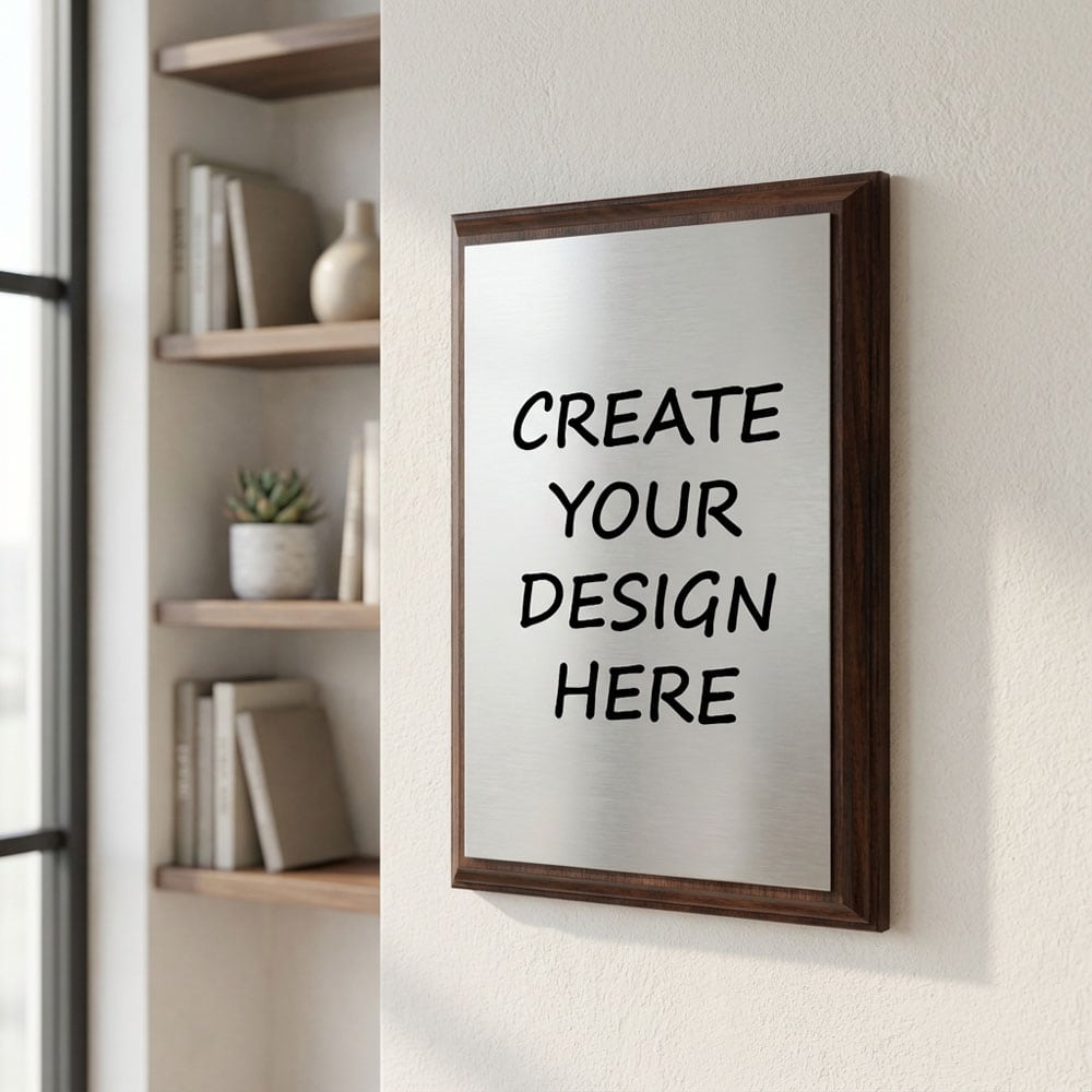 Your plaque design can include images, text, or a combination of both – including photos, logos, and personalised wording. The design is printed on a sleek silver-effect metal sheet, then professionally mounted on a stylish wooden backing for a refined, high-quality finish.