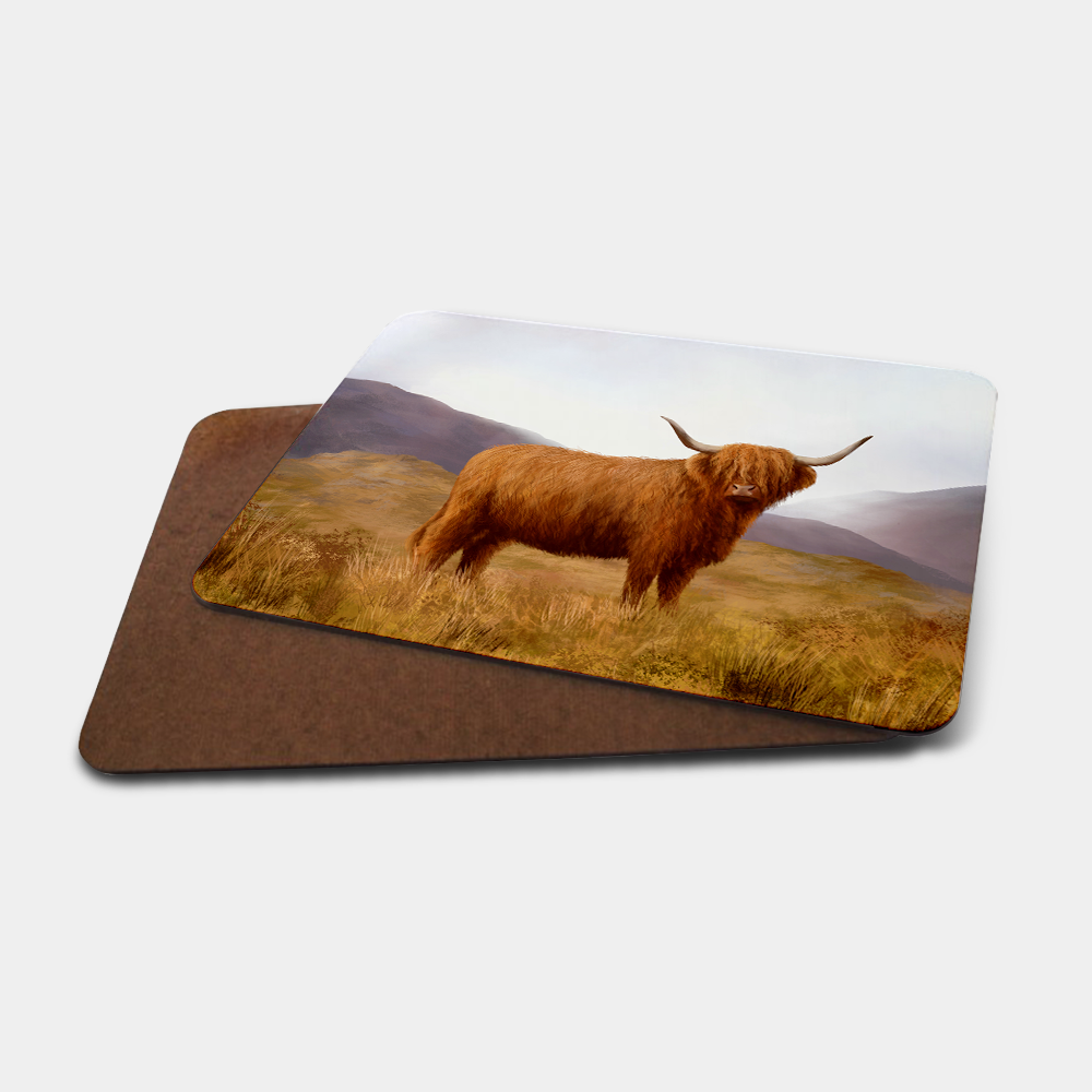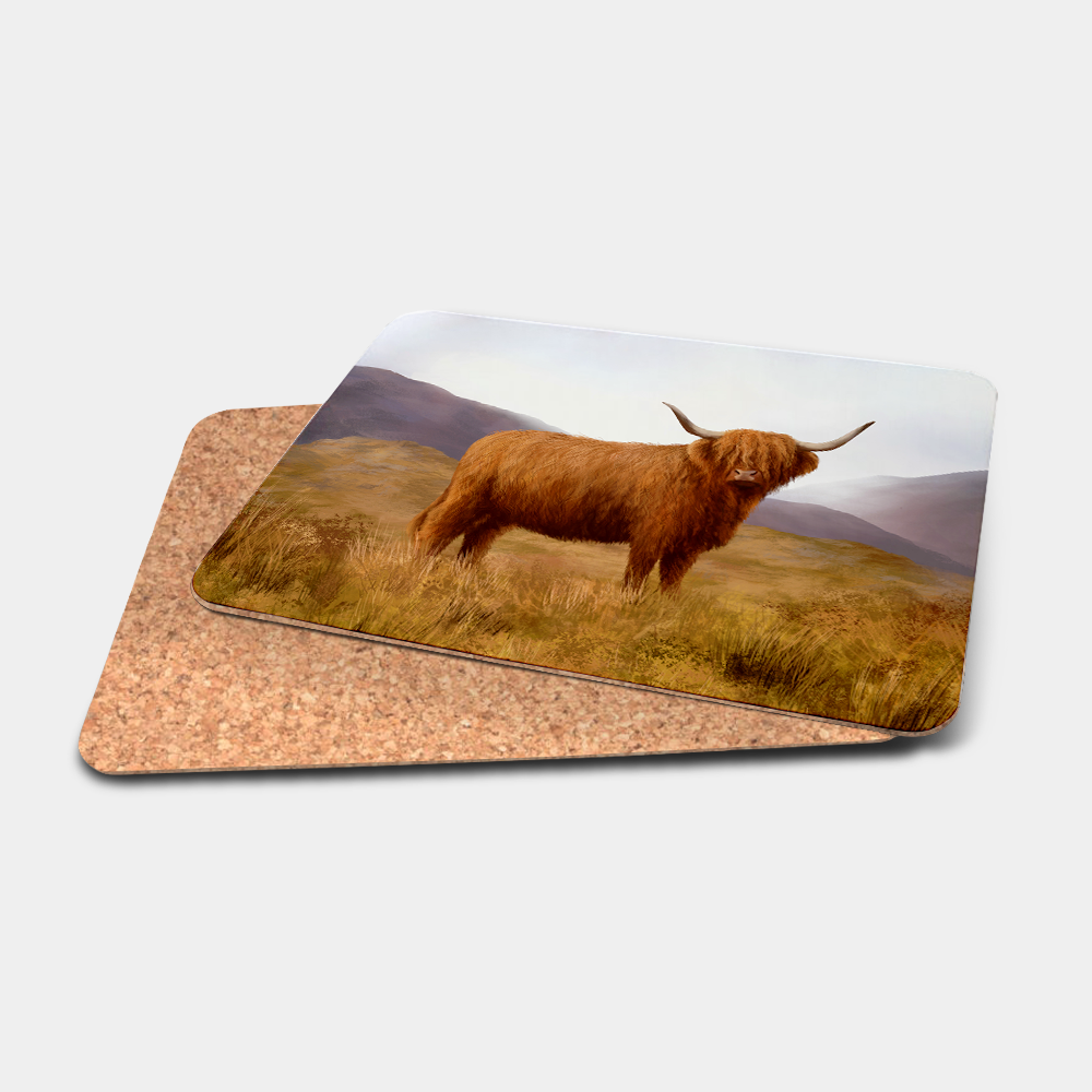 These premium gloss-finished placemats feature a durable cork or board backing and showcase an exclusive Highland Cow design, expertly created by one of our talented local artists.
