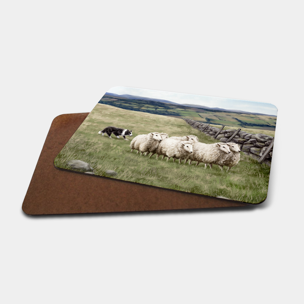 These premium gloss-finished placemats feature a durable cork or board backing and showcase an exclusive Sheep & Sheepdog design, expertly created by one of our talented local artists.