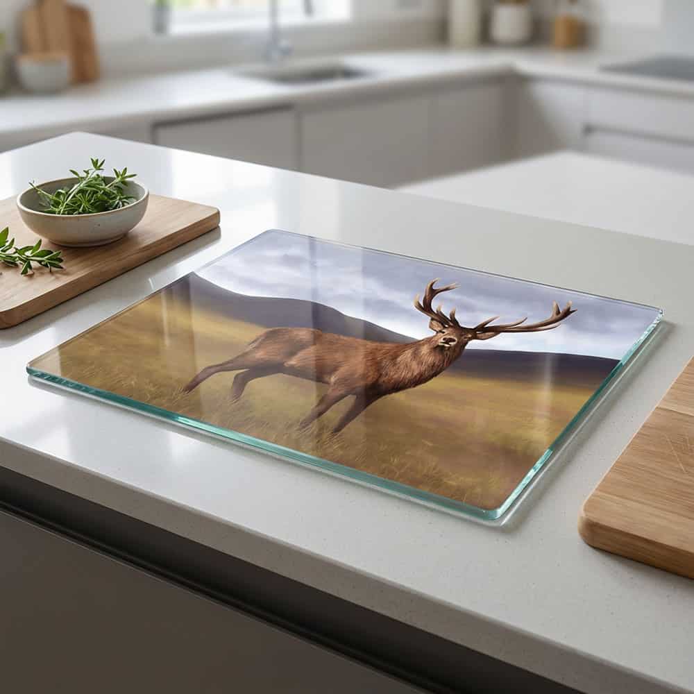 Discover our superb quality, toughened-glass worktop savers, beautifully printed with a Stag design created by one of our talented local artists.