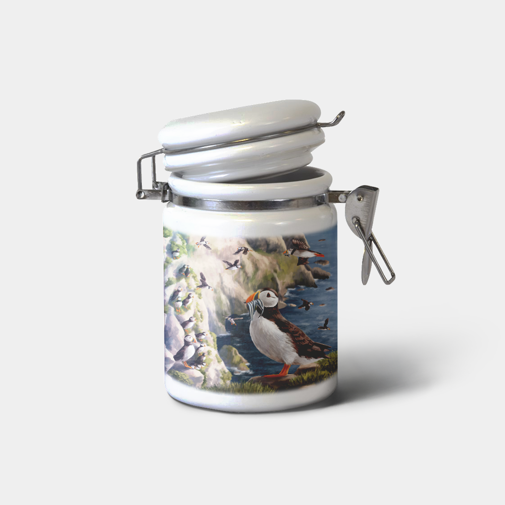 These gloss-finished, ceramic storage jars feature a delightful Puffin design, created by one of our talented local artists.